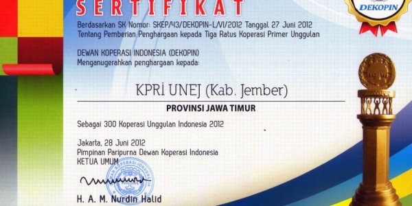 Alhamdulillah , Puji syukur atas rahmat ALLAH SWT, tahun ini (2012) KP-RI Universitas Jember masuk 300 koperasi unggulan se-Indonesia yang diberikan oleh Dewan Koperasi Indonesia (Dekopin) yang bertekad untuk memajukan dan mengembangkan koperasi yang ada di Indonesia.